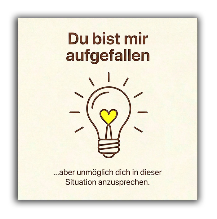Sie steht in einer geschlossenen 5er-Gruppe Freundinnen? Da reinzugrätschen traut sich kaum jemand. Die Karte ermöglicht dir den "Vorbeiflug": Tipp sie kurz an, gib ihr die Karte und geh weiter. So muss sie sich nicht vor der Gruppe rechtfertigen, sondern kann später selbst entscheiden.