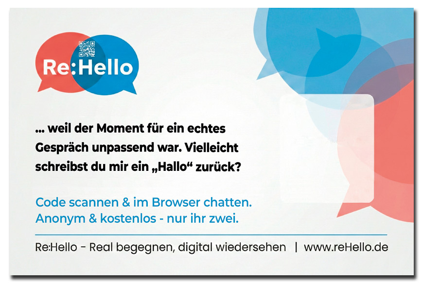 Mit dem Text auf der Rückseite beweist du echtes Feingefühl. Du zeigst, dass du die Stimmung im Raum lesen kannst und anerkennst, dass ein echtes Gespräch gerade einfach deplatziert wäre (oder dein Puls es gerade nicht zulässt). Du überlässt der anderen Person völlig entspannt und ohne den geringsten Druck die Entscheidung, das leise Hallo auf der digitalen Ebene zu erwidern.