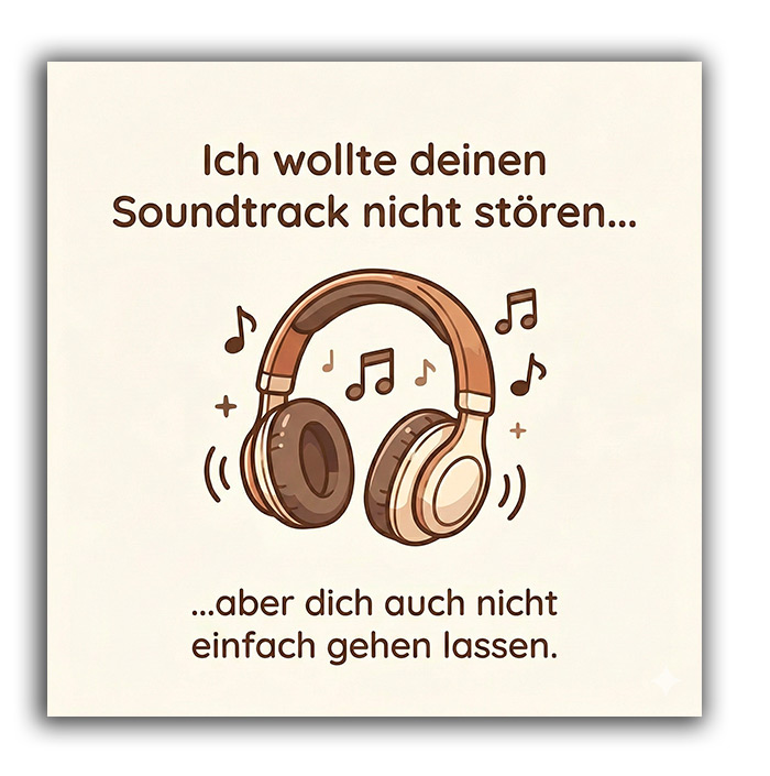Kopfhörer sind das internationale Zeichen für: "Ich bin in meiner eigenen Welt." Diese Karte ist deine Eintrittskarte genau dort hinein – ohne unhöflich zu stören oder jemanden zu erschrecken. Sie überbrückt die Distanz lautlos, respektvoll und mit einem Augenzwinkern. Perfekt für Bahnfahrten, Bibliotheken, im Gym oder den Park, wenn Worte gerade nicht passen.