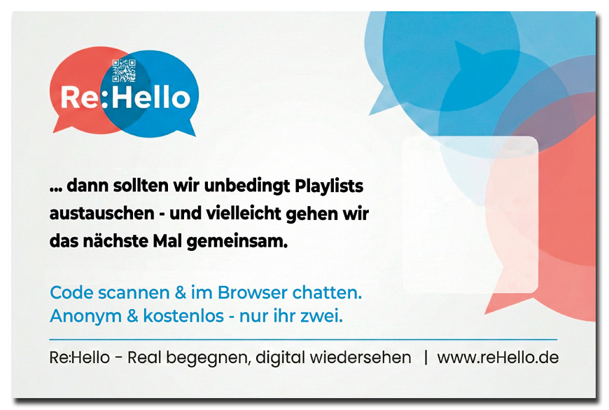 🎸 Der „Nach der Zugabe“-Moment: Das Konzert ist vorbei, das Saallicht geht an und alle strömen glücklich Richtung Ausgang oder Garderobe. Du bist die ganze Zeit neben einer Person gestanden, die genauso laut mitgesungen hat wie du. Drück ihr beim Rausgehen die Karte in die Hand: „Mega Konzert, oder? Das hier ist für die Aftershow.“