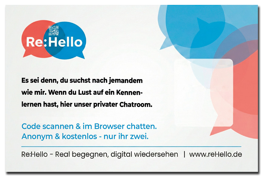 ☕ Das Café / Die Bäckerei: Ihr steht in der Schlange oder sitzt an benachbarten Tischen. Beim Rausgehen legst du die Karte neben ihre/seine Kaffeetasse oder drückst sie der Person in die Hand mit einem knappen, sympathischen: „Lohnt sich zu lesen.“