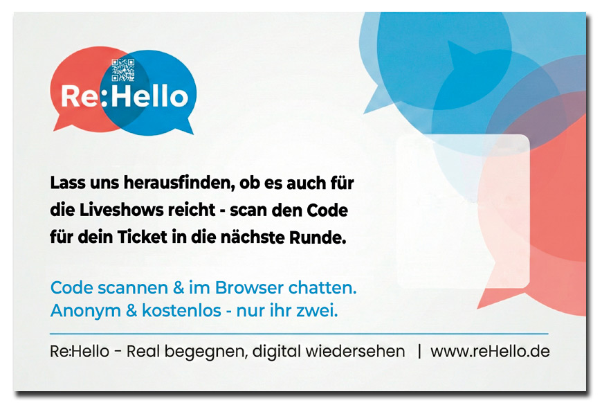 - Innen (Der Hook): Lass uns herausfinden, ob es auch für die Liveshows reicht - scan den Code für dein Ticket in die nächste Runde.