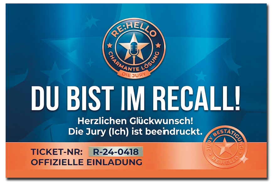 Jeder kennt die berühmten Worte aus dem TV: Das Bangen, das Zittern und dann die Erlösung – "Du bist im Recall!". Warum diese ikonische Popkultur-Referenz nicht einfach für das echte Leben kapern? Mit dieser Karte zeigst du sofort, dass du dich selbst nicht zu ernst nimmst, kreativ bist und ordentlich Humor mitbringst.
