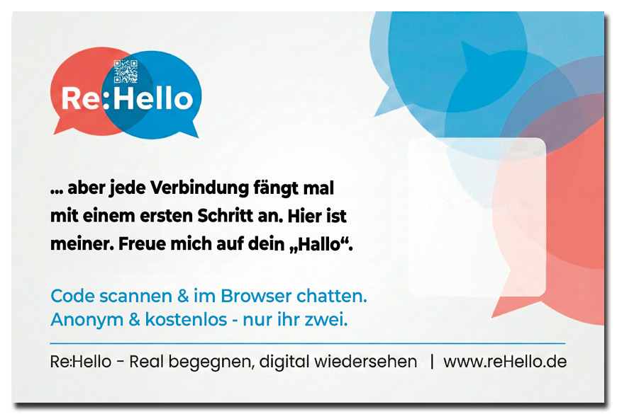 Keine lauten Sprüche, keine künstlichen Aufhänger, nur pure, sympathische Ehrlichkeit. Diese Karte ist der universellste Begleiter in deinem ReHello-Deck. Sie bringt es charmant auf den Punkt und beweist genau die richtige Mischung aus Mut und Entspanntheit. Ideal für absolute Zufallsbegegnungen im Alltag, bei denen es keinen speziellen Kontext braucht – außer Sympathie.