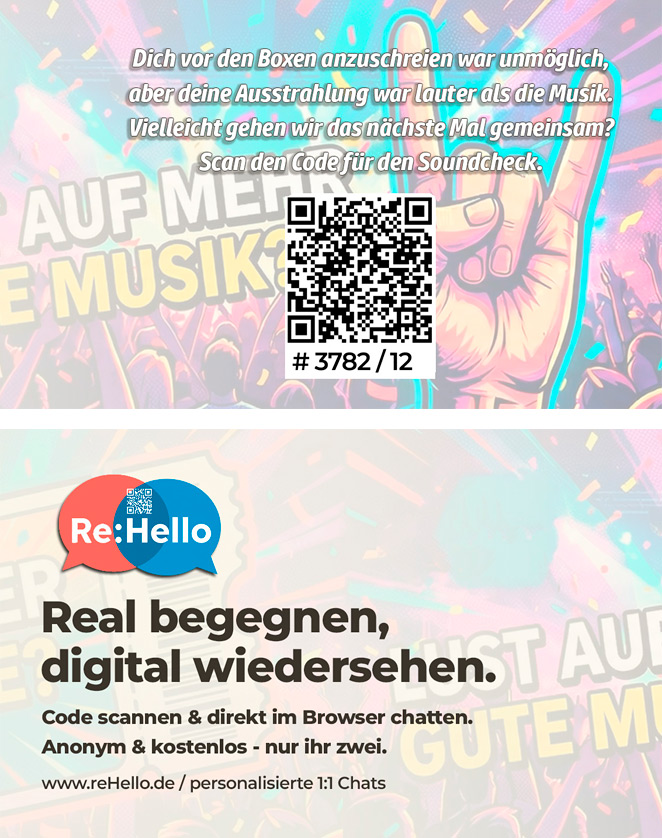- Innen (Der Hook): Dich vor den Boxen anzuschreien war unmöglich, aber deine Ausstrahlung war lauter als die Musik. Vielleicht gehen wir das nächste Mal gemeinsam? Scan den Code für den Soundcheck.